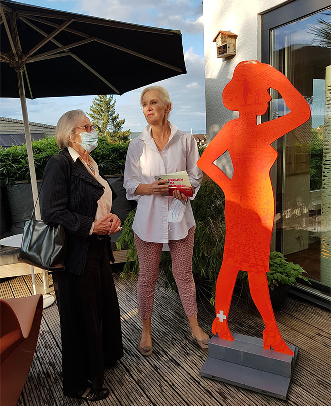 Den Anlass im August genossen wir bei unserem Mitglied Evelyn Dönicke. Speziell für uns organisierte sie eine Pre-Vernissage ihrer Ausstellung. Sie präsentierte ihre Helvetia-Figur, die sie für das Kunstprojekt «Frauen im Bundeshaus» als eine der 67 Künstlerinnen geschaffen hatte.