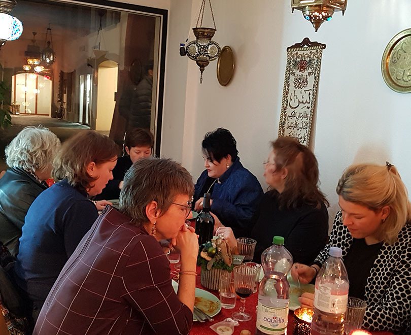 Die Wahl fiel (wie beim September-Anlass) auf das Restaurant einer syrischen Migrantin. Sie erreichte mit Hartnäckigkeit, Geduld und Ausdauer in Liestal mit ihrem Restaurant «Aleppo» eine Selbstständigkeit aufzubauen. Dabei besann sie sich auf das, was sie gut konnte und womit sie sich nun eine stetig wachsende Stammkundschaft aufbaute – ihre ausgezeichneten syrischen Kochkünste. So haben wir die frische und authentische Küche genossen. Nahed ist eine warmherzige und aufmerksame Gastgeberin. Sie ist stolz darauf, ihr Leben ohne fremde finanzielle Unterstützungen zu bestreiten. Ihren Erzählungen war anzuhören, dass die Wunden von dem, was sie auf der Flucht erlebt hatte, noch lange bleiben werden.