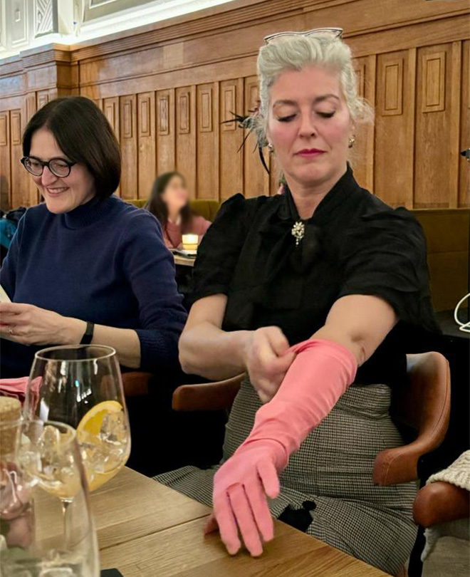 «Miss Maizie Bloom» erzählte uns von ihrer Karriere als Burlesque-Tänzerin. Sie zeigte uns auch einige Gadgets aus ihren Shows, wie die sogenannten Tassels, lange rosa Handschuhe oder eine schwarze Federboa. Erfreulich war, dass drei Interessentinnen an dem Anlass teilnahmen.